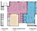 The bistro lounge provides a welcoming atmosphere where employees can relax and recharge, featuring a grab-and-go food and beverage service for those on the move. A well-equipped bar and kitchen prep area for catering enhances the space, making it ideal for hosting events. Enjoy a variety of seating options, from booths, tables and chairs, high-top tables, and a comfortable bar area. For entertainment, the lounge offers TVs and table games and is equipped with Wi-Fi.